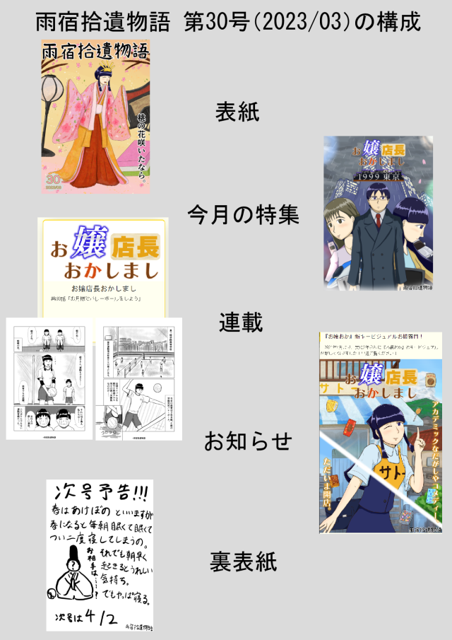 月刊誌だから、最初と最後に表紙・裏表紙があります。巻頭のショートエッセイがあって、毎月の特集があります。この号では来月号から連載がスタートする『お嬢おか』の新章を特集しているわ。