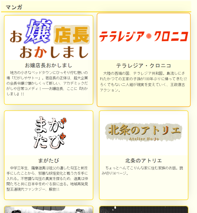 それから毎月の連載作品を掲載。ここが一番のメインコンテンツね。『お嬢おか』は基本的に毎月連載しています。それ以外の作品は、作者に余裕があったら、ね。