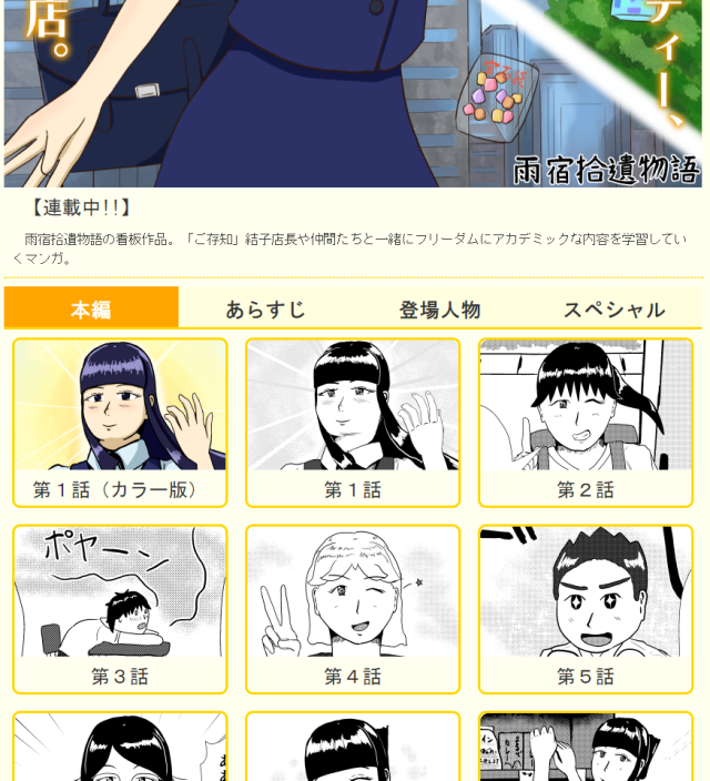 見たい作品をポチッと押すと、このように作品ページが開くわ。ここから本編を読むことができるし、あらすじや登場人物の紹介なんかも読めるの。