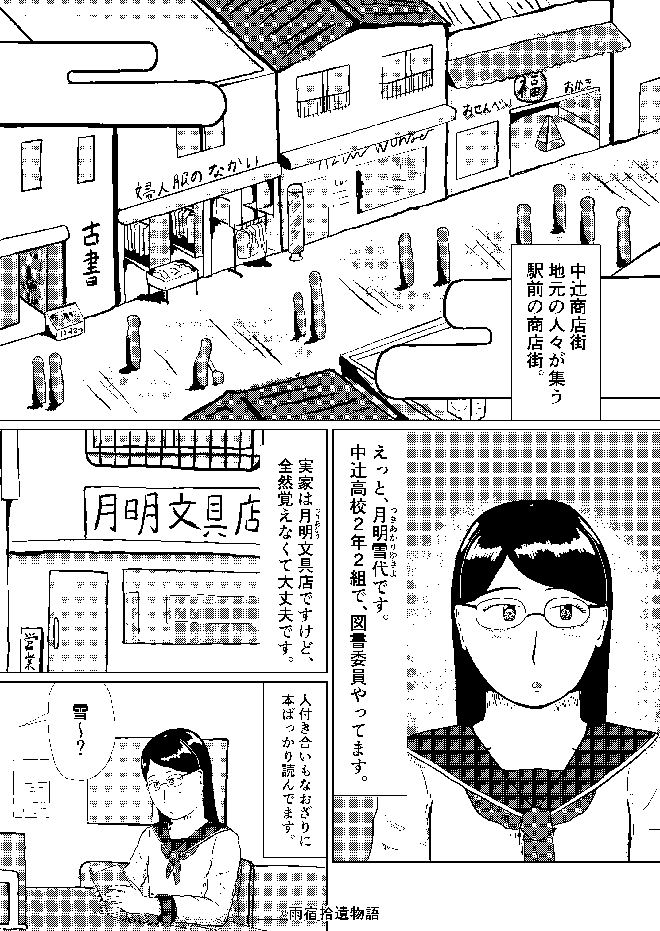 これは街の風景を「微分」したものでもありますが、冒頭にこうしたおやくそく表現を入れて作品全体に和風なテイストを吹き込むねらいがあります。僕の作品は全般的に水墨画的な「和」を感じさせる成分が含まれていることはみなさんならもうお分かりのことでしょう。この作風をはじめに理解していただくためにもこのような鳥観図からはじまる第1話を描いたのです。これを見たあとであれば主人公の結子店長が度々古語表現を使うのもちょっと納得というか、しっくりくるところがありませんか?