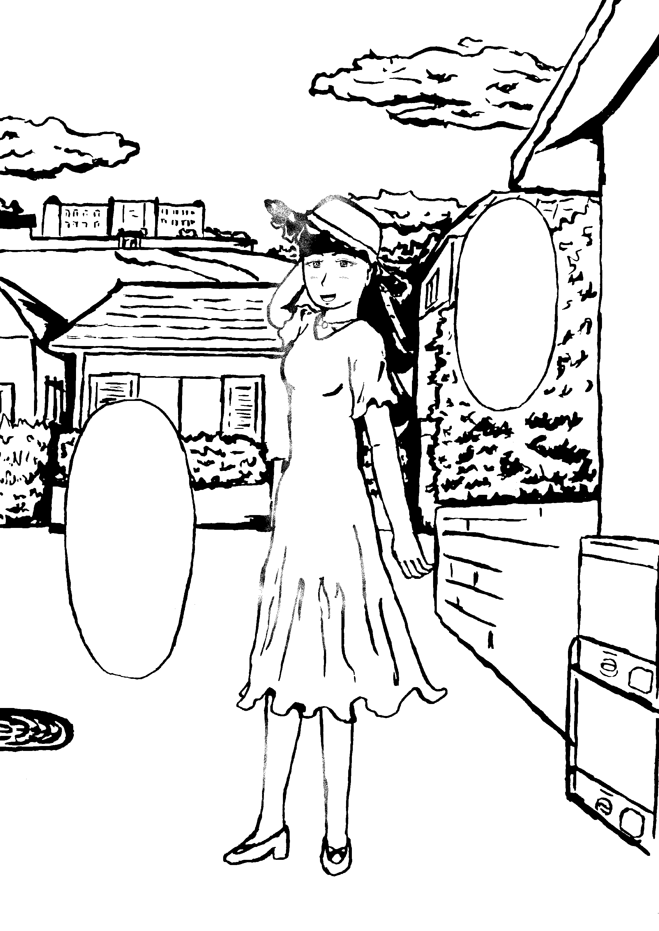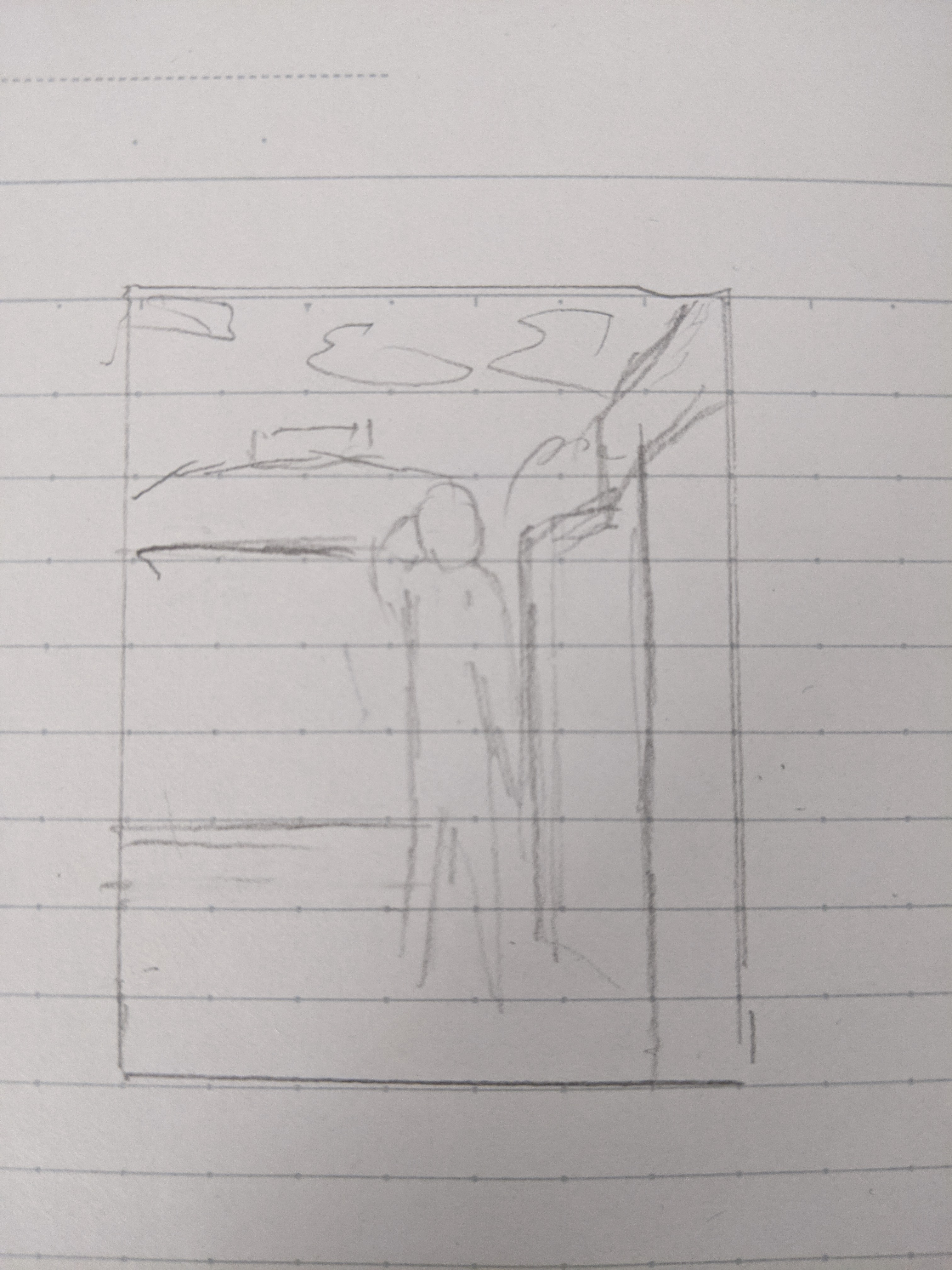 原稿用紙に描く前に、どんなものを描くのかしっかり決めとかないことにはにっちもさっちもいかない。別な紙におおまかな構図を描いてラフ案を練りましょう。今回のラフはこんな感じ。