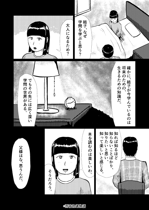 お父様の台詞はこの作品の主題です。知的好奇心を満たして幸せになれる生き物なんて、人間の他にいないでしょうね。だから僕はこの作品を描いたのです。