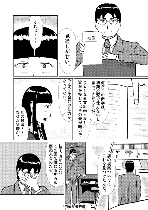 7ページ、経営の何たるかが分かっていない店長をお父様が叱責するシーン。実は第9話の最後でお父様が向かっていた場所はサトーだったんですね。「結子、お前の父はこの国で誰にも劣らぬ商売人なのだぞ。」って言ってみたい。つよすぎる。