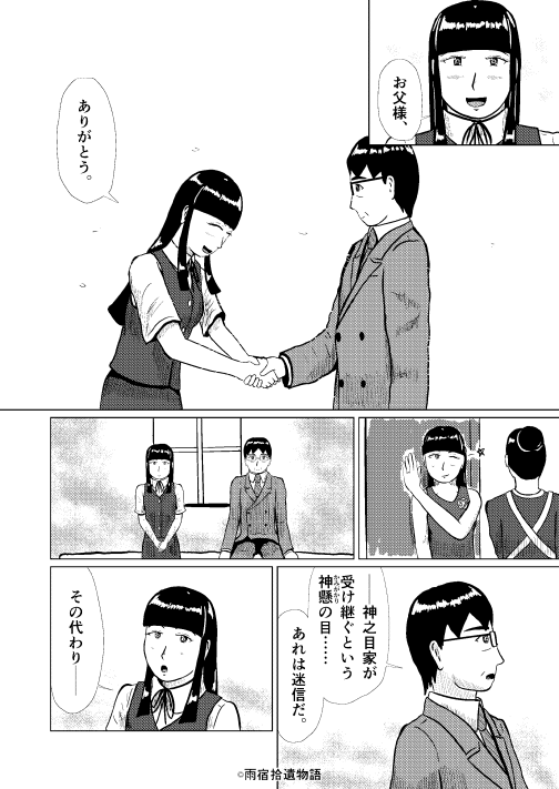2ページです。勇気を出して直談判しに行った政直くんを姫乃ちゃんが労うシーン。いいですね。中辻市と神之目家の関係は描ききれてませんが、人々に慕われている神之目さまにアポなしで会いに行くなんて相当に畏れ多いことなのでしょう。