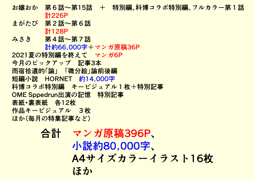 その「書き貯め」が尽きたのが2020年12月、第3号掲載の内容くらいまでです。つまりそれ以降は毎月の更新をしながら執筆をしていました。「連載」ですね。ですから第4号(2021/1)~第15号(2021/12)までの掲載内容を振り返れば、「雨宿拾遺がコンスタントに書き続けられる原稿量」を推し量ることができます。