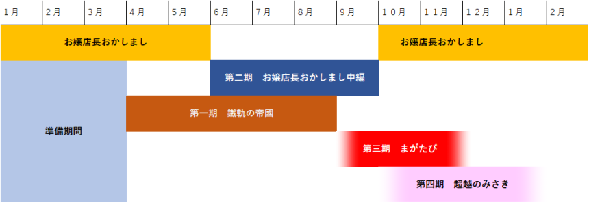 このことを春の内に決定しておけば、読者の皆さんには早い段階から連載時期をお知らせしておけます。便利じゃないですか?これでもう「雨宿ォ!早く○○書けぇ!(怒)」と言われないで済むね(言われたことないけど)。