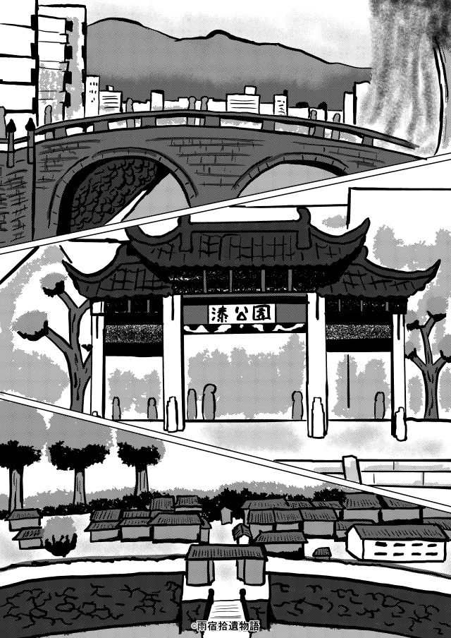 最近は「現実の風景にピッタリ重なるアニメ背景」とか人気ですが、僕は絶対マネしません。これはマンガの世界なんですから、多少寸法狂わせても「絵」として描くのがいいと思うんですよ。それに、写真をなぞらないからこその表現もあります。例えば、現実じゃ画角の関係で絶対同時に写せない二つのものを隣り合わせて描くことができます。言うなれば、「清水の舞台」と「富士山」を同時に描くとかね。