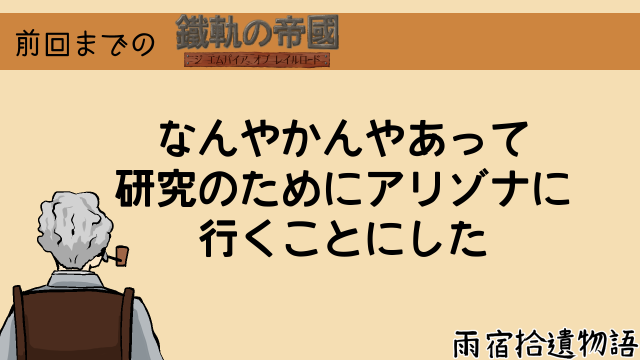 「時化を抑える研究のために更なる調査を必要としていたロバートはアリゾナの大地にあるという時化の異常発生する土地『大きな穴』の存在を知り、この地で研究を続けることを決意しました。三人も旅の同行を決意したはいいが西部アリゾナ準州と言えば噂に聞く危険な開拓地。その旨手紙で叔父上に伝えた彼は激励と共に叔父上愛用の回転式拳銃を受け取ったのでした。」