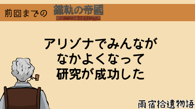 「――さて、前々回の『鐵軌の帝國』はロバート技士らがアリゾナに向けて旅立ったところでおしまいでした。前回の始まりは東へ向かう列車の中からでしたね。」
