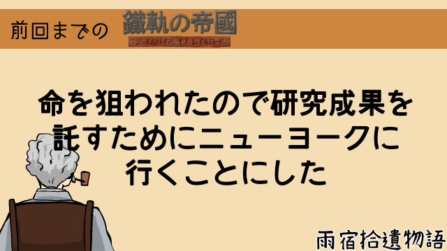 「部屋に引きこもっていた技士を刺客が襲いました。今や一介の技士は命すら追われる存在。そんな彼を助け出したのはかつての仲間たち。これからの行く末に思い悩むうち、彼はある手紙を手にします。そこに書かれていたのは『ニューヨークに来れば君の研究成果だけは保護できる』という何者かからの達し。如何にも怪しい便りですが、彼は一縷の望みを託してニューヨークに向かうのでした。」