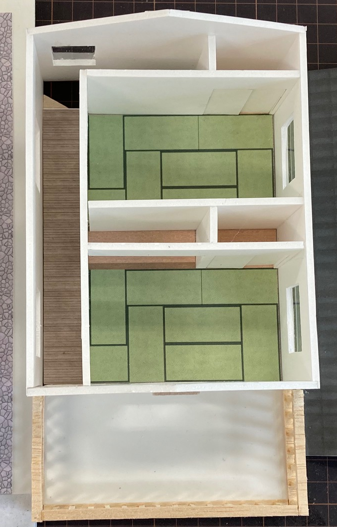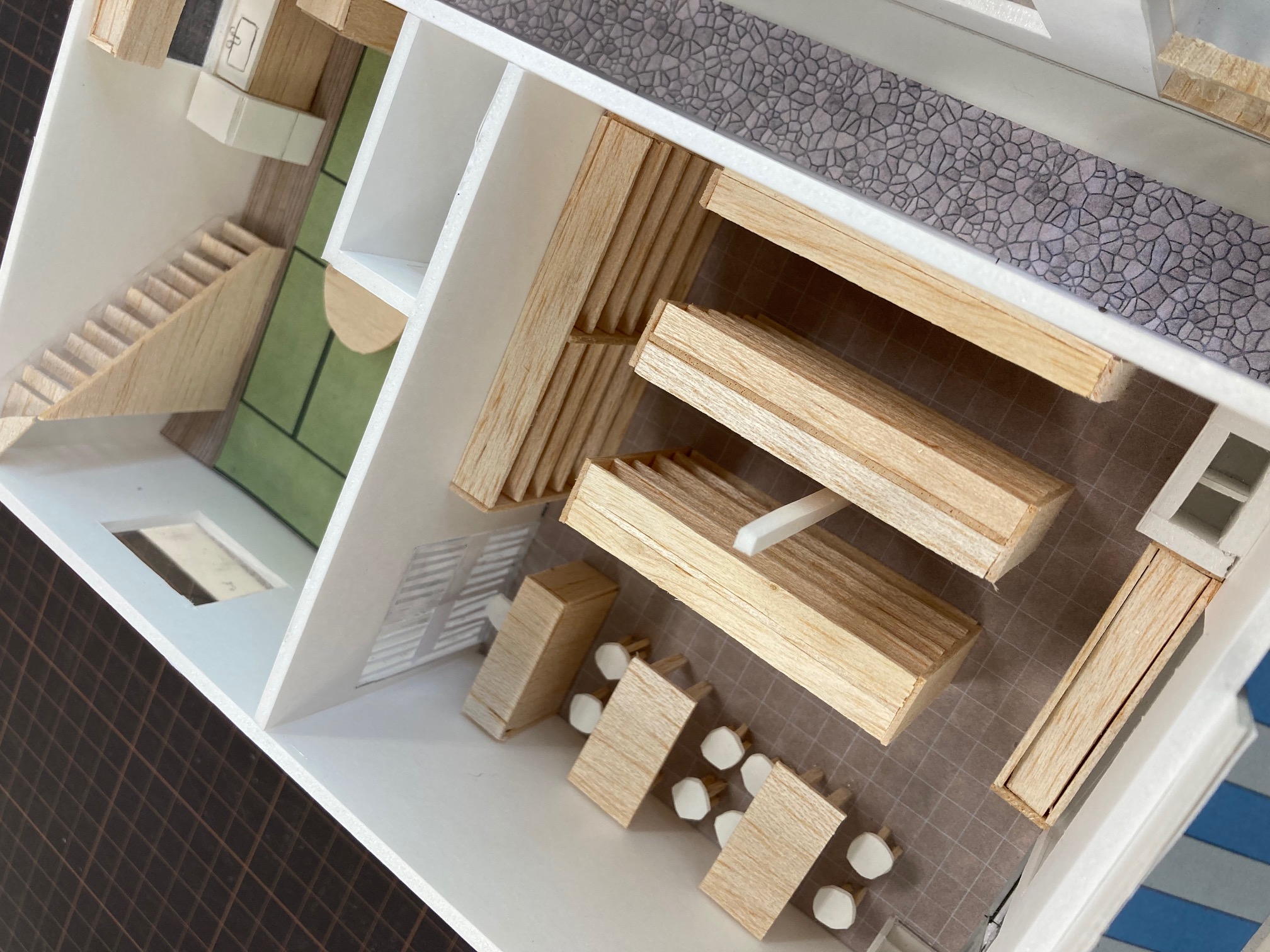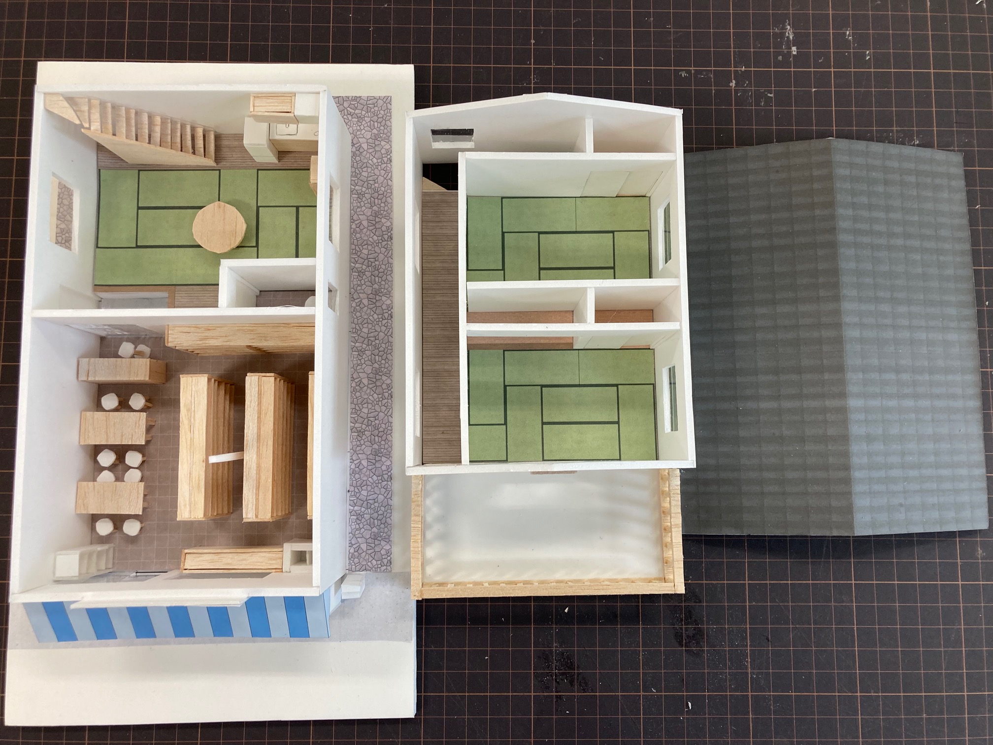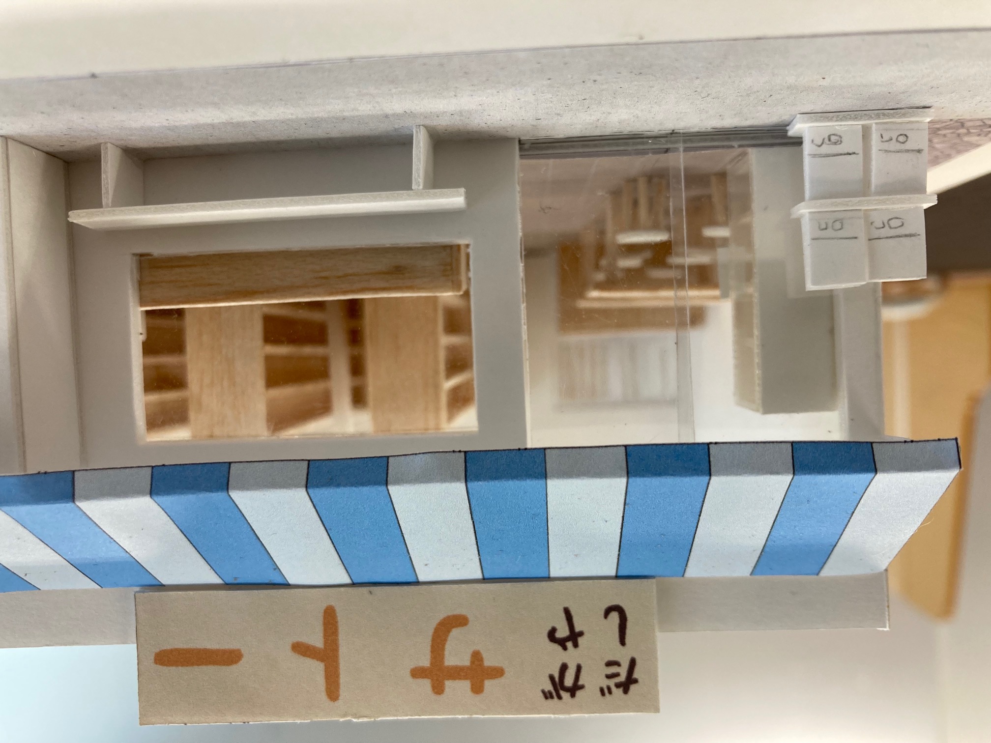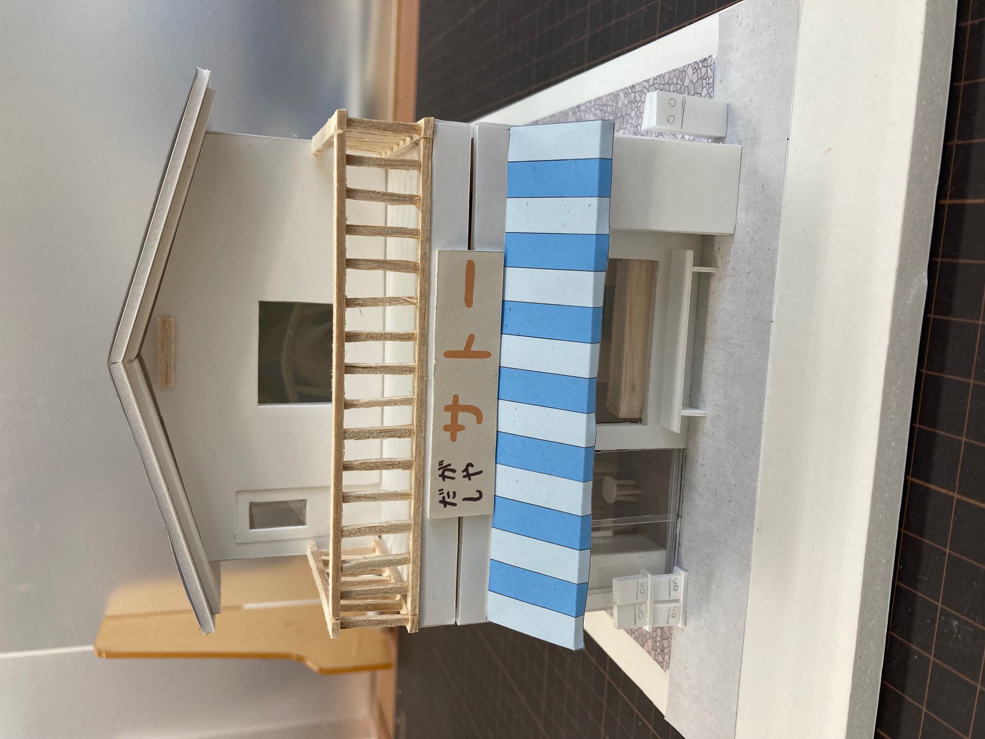 もともと『お嬢おか』連載開始前から「だがしやサトー」については簡単な間取り図と立面図だけを用意してあったのですが、そろそろ作ってみようと、詳細な図面を引き直して模型で再現しました。