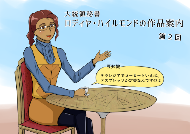 それと、『テラレジアの歩き方』はもうご覧になってくださったかしら。作品の舞台「テラレジア共和国」について様々な情報を掲載していますわよ。こちらも本編の更新に合わせてどんどん追加されていくから要チェックですの。作品の世界観については作者もかなり緻密に練り上げたらしいから、みなさまはアーク様たちと一緒にこの国を旅するつもりで楽しんでいただきたいですわね。