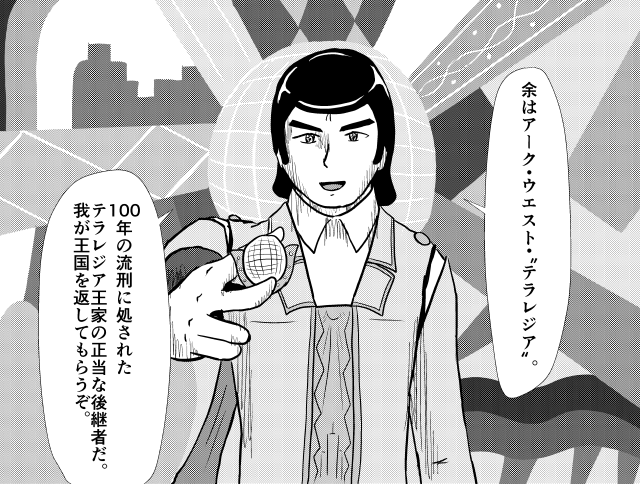 で、それから100年が経ちまして。王家の子孫は約束通り戻ってきたのですわ!その殿方の名はアーク・ウエスト・〝テラレジア〟様、正真正銘、テラレジア王家の直系の子孫で当代なのです。