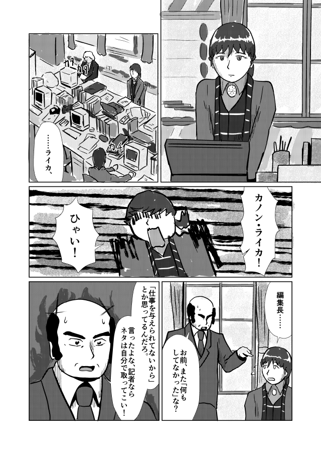 さて、ところ変わって、テラレジアの首府の片隅、庶民の街「太陽通り」。大手新聞「テラレジオ・ポスト」社の新米記者カノン・ライカは上司に叱責されながらうだつの上がらない日々を送っていました。