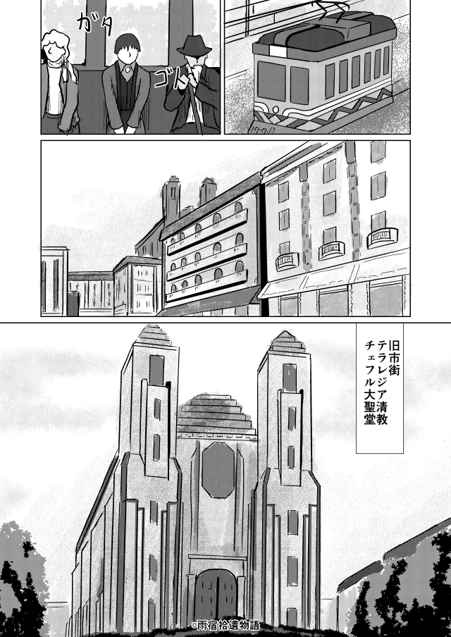 大聖堂へ来たはいいものの、取材許可証がなかったので門前払いを食らったカノン。意気消沈して歩いていた聖堂の裏庭で、怪しげ~な二人組を発見します。関係者ではなさそうな二人組の後をつけて彼女も大聖堂に足を踏み入れるのだけれど……それって不法侵入じゃないの?