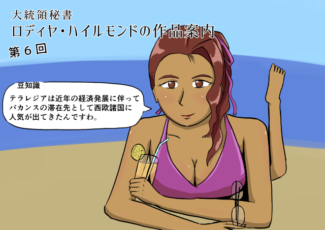 テラレジア共和国大統領の秘書、ロディヤ・ハイルモンドさん。セクシーな小麦色の肌に赤い髪、ちょっと古臭い伊達メガネがお似合いのレディーです。脚本の再構成によって出番がなくなったいわゆる「没キャラ」でありながら、作品の案内役として奇跡の復活、読者のみなさまに強烈なインパクトを与えました。