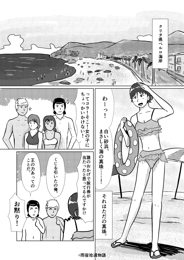 季節は夏。主人公三人組がやってまいりましたのは、クリタ県のペルロ海岸。ペルロといったら、リゾート地として名高い風光明媚な港町ね。その中でも三人が滞在しているのは外国人観光客向けのお高いリゾート。なんでも、太陽通りの商店街のくじ引きで旅行券が当たったそうなのよ。アレってちゃんと当たりが入ってるのねえ、あたくしロディヤはパスタのセットまでしか当たったことありませんわ(しかも賞味期限が近いの、どうせ在庫処分よ)。