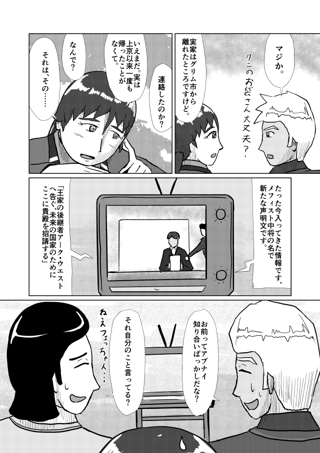 グリム県はカノンの出身でもあります。郷のお母様は大丈夫かしら。などと言っていたところにメフィストからの公式声明が。「王家の後継者アーク・ウエストへ告ぐ、未来の国家のためにここに貴殿を招請する」ですって。名指しでお呼び出し。相手は銃を持った軍人だけど、大丈夫かしらね。