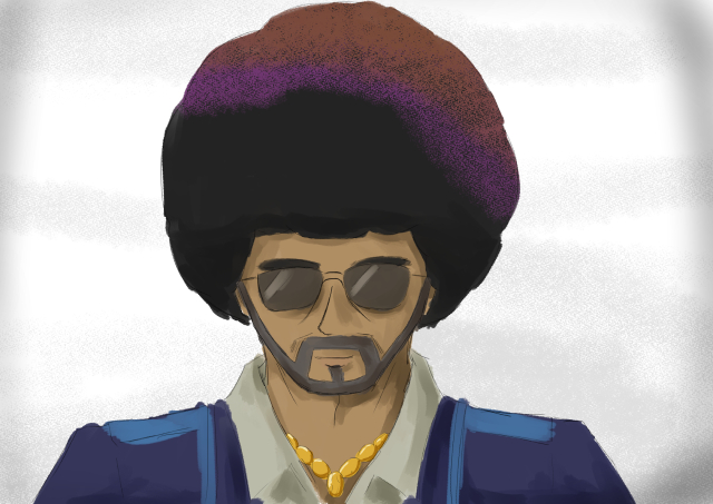 フェっちゃんです。今作では一張羅であちこち出歩くため、ワイルドながらもちょっと上品さを感じられるようにしました。彼の髪色は元々明るめの茶髪だったんですが、11年前の事件で捕まってから色が抜けました。髪を塗りつぶす手間が省けてよいのです。