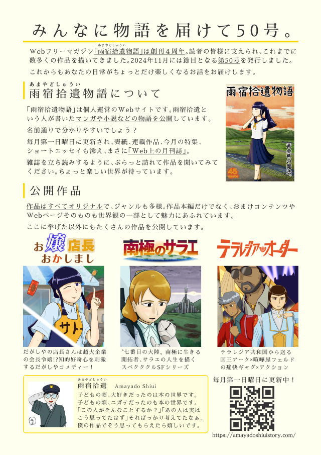 ↑宣伝用チラシ。ただ「マンガや小説書いてる」だけじゃつまらないと思い、少しユニークな書き方をしている。
