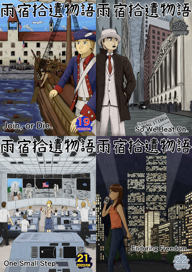 第19号がボストン茶会事件、副題はアメリカ独立に深くかかわったベンジャミン・フランクリンの著作から「参加するか、死か」。独立こそが我々の生きる道であるというアメリカ市民の意志をよく表しています。第20号は世界恐慌時のニューヨーク証券取引所。副題は1920年代アメリカの小説家スコット・フィッツジェラルドの著作『偉大なギャツビー』から最後の一節「そして僕たちは進み続ける、流れに逆らう舟のように、絶えず過去へ押し流されながらも。」です。第21号はアポロ11号の月面着陸のシーン。副題はアポロ11号船長ニール・アームストロングの言葉「これは一人の人間にとっては小さな一歩だが、人類にとっては偉大な一歩である。」第22号は2001年アメリカ同時多発テロで倒壊したワールドトレードセンター、副題はその後にアメリカ軍が発動した軍事作戦「『不朽の自由』作戦」のこと。
