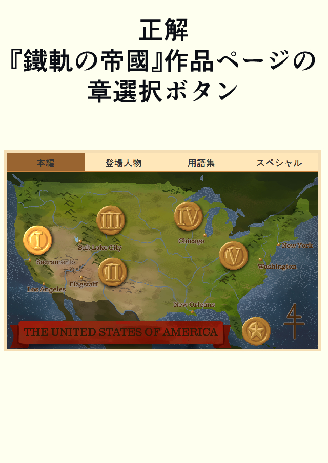 『鐵軌の帝國』作品ページのエピソードを表示するボタンの一つね。実はPC版では作品ページの各章を表示するボタンが凝った演出になっており、これはそこに使用されているものなの。