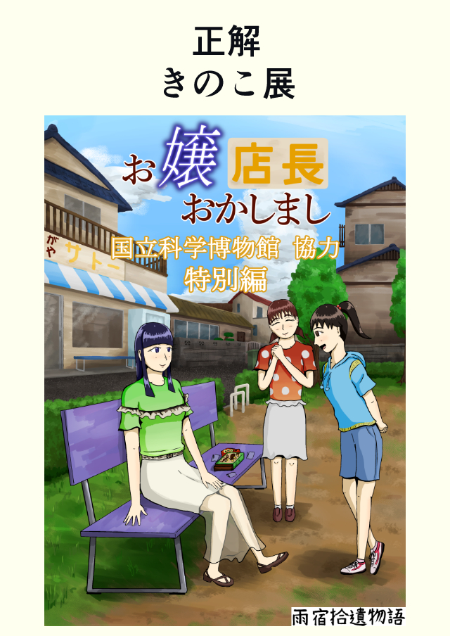 正解。雨宿拾遺物語は『お嬢おか』の特別編を公開、会場には雨宿拾遺が描いたきのこイラストが展示されたよ。