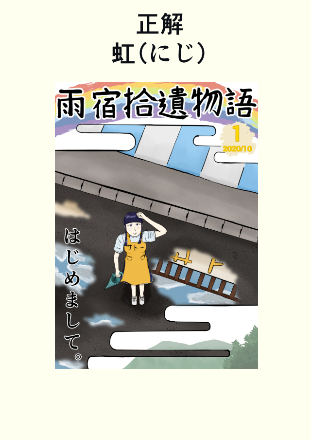 「雨宿り」だから雨上がりの虹を描いたんですって。残念ながら正解者なし!