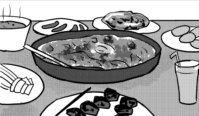 古くから豊穣の地と謳われたテラレジアは食品が多種多様。肉、野菜、果物、魚介、乳製品、酒、嗜好飲料、何でも食べます。それらを美味しく食べるための調理法もたくさん。内戦中・戦後の食べ物に乏しい時代を知っている人々にとって、お腹いっぱいにごはんが食べられることは何よりの幸福なのです。