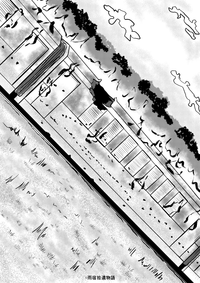 反動が収まって壁から手を離したロバートは、機関車と一号車の連結部に足を踏み出した。暗闇の中に足元の台車から響く走行音は腹の底に伝わるようで、それが不気味である。炭水車に掛けられた梯子を上がって上に立てば、進行方向向かって前は夜空に煙を吐き出す機関車、後ろは鋼の屋根が連なっているのを見ることができる。灯りがないので列車の周りの景色を殆ど確認することはできない。それでも風と共に何かが高速で近付いては遠ざかっていくのを肌で感じられる。この闇の海に落ちれば朝を迎えられずに一生そこに置いて行かれてしまうだろうか、そんな気持ちにさせられる。