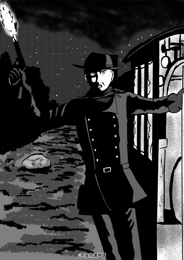 次の瞬間、彼は後ろから体を掴まれて無理矢理に引き剥がされていた。窓際のテーブルでカードをしていた老人三人組が彼を壁に引き倒す。