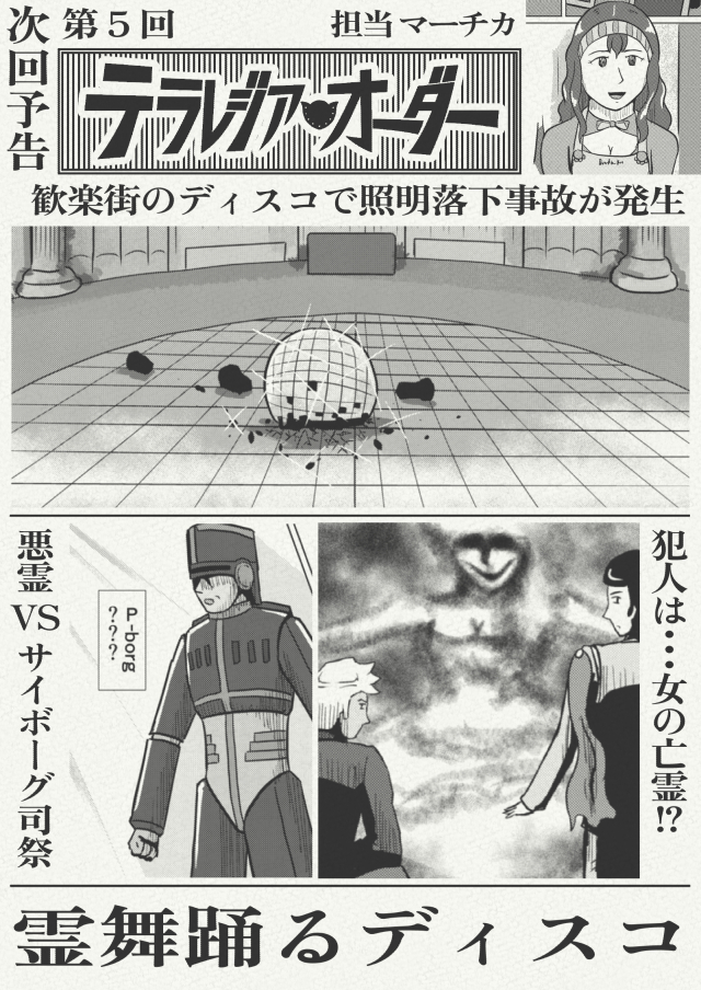 さてさて、次回はディスコで起きた事故をめぐるお話。幽霊やサイボーグが登場するんだって。とんでもないオカルトの予感~。「霊舞踊るディスコ」、お楽しみに!